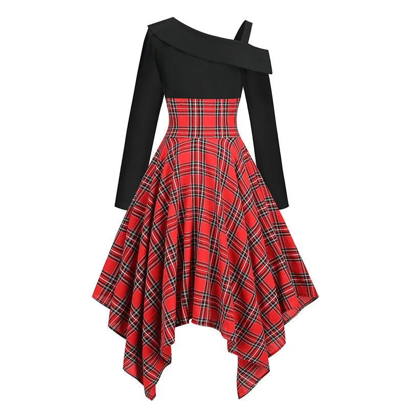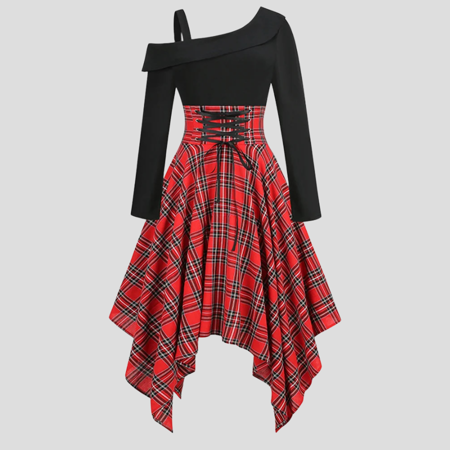 Asymmetrisk Punk Rock Kjole i Rød Ternet med Korset