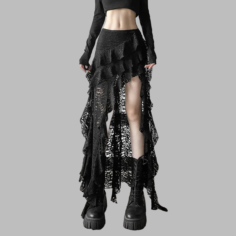 Asymmetrisk Sort Gotisk Punk Nederdel med Blonde og Frynser