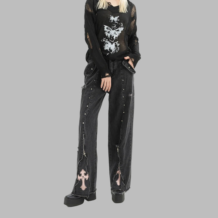 Gothic Punk Denim Bukser med Kryds og Nitter, Brede Se muligheder