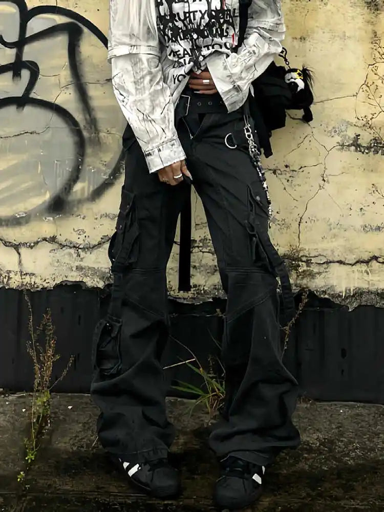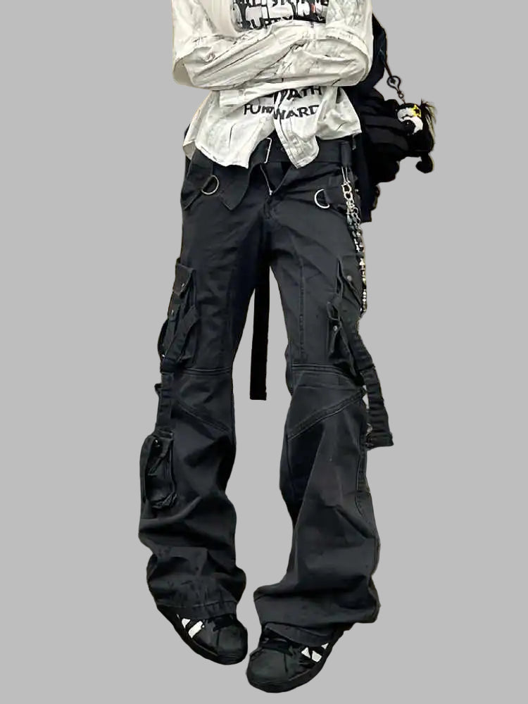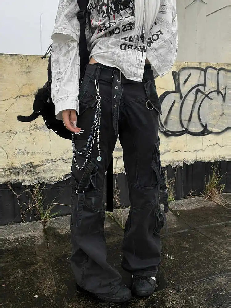 Unisex Gotiske Sorte Cargo Bukser med Lommer og Kæder