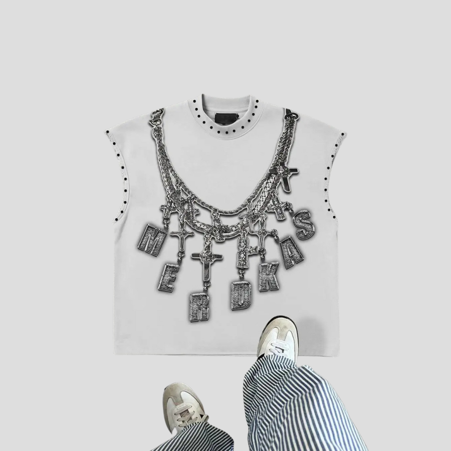 Koszulka Biała Punk z Grafiką Łańcuchów Metalowa