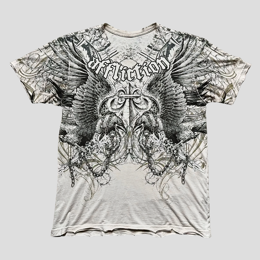 Hvid T-shirt med gotiske vinger og kors