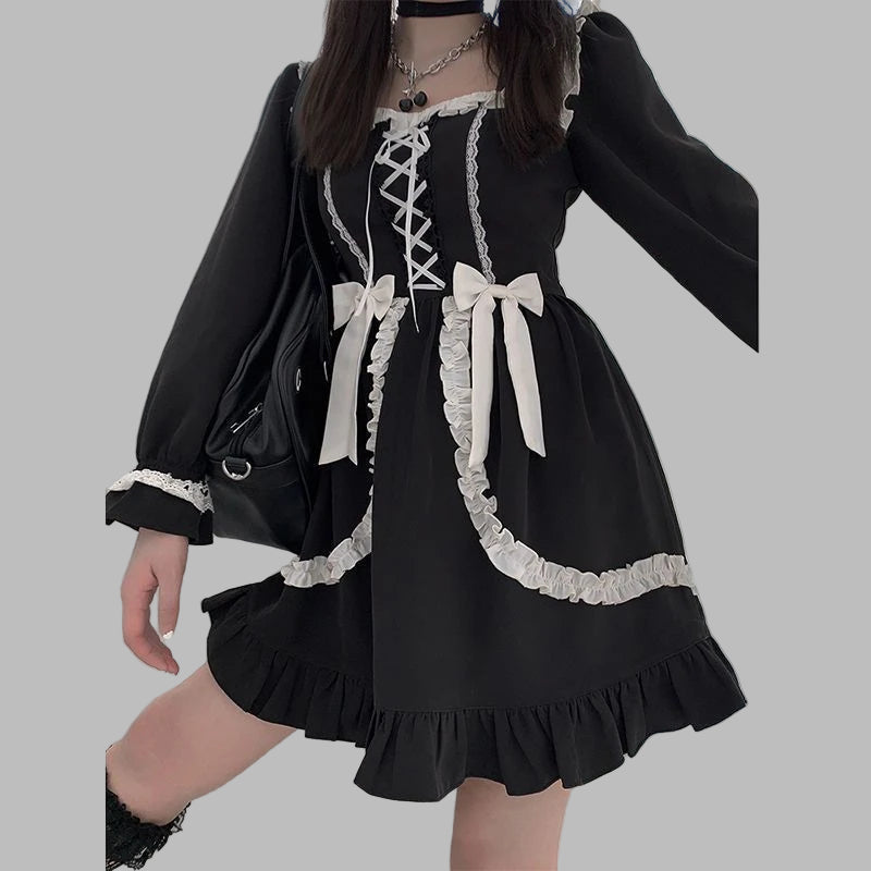 Jirai Kei kjole med hvide sløjfer og snøring sort