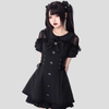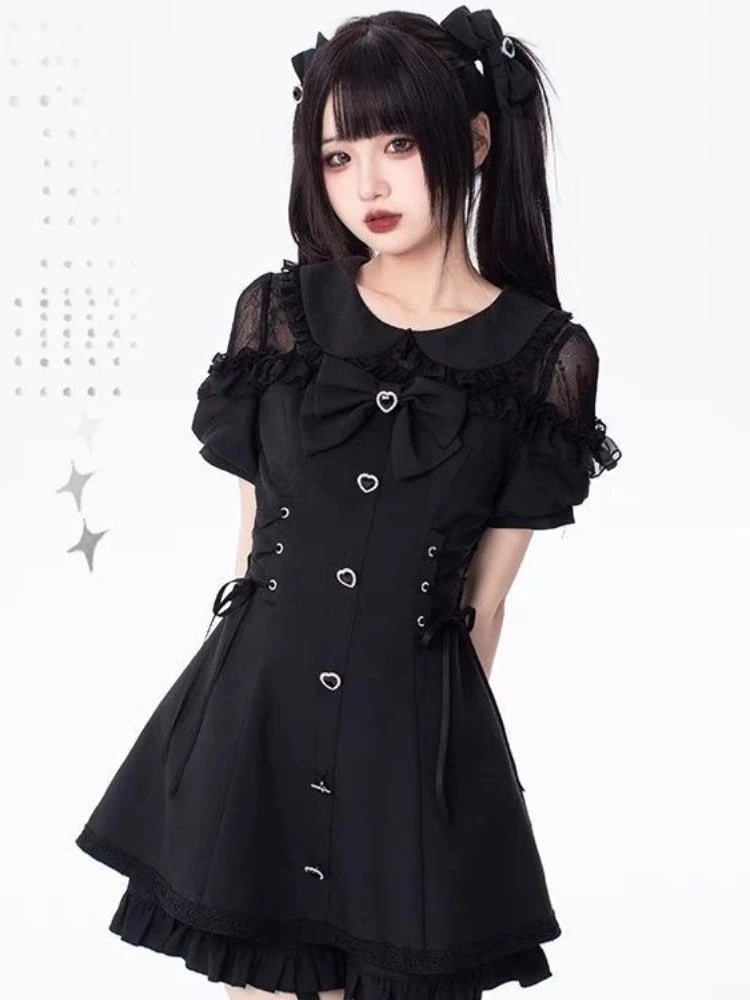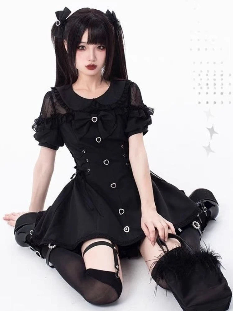 Jirai Kei Sort Kjole med Hjerteknapper Flæser