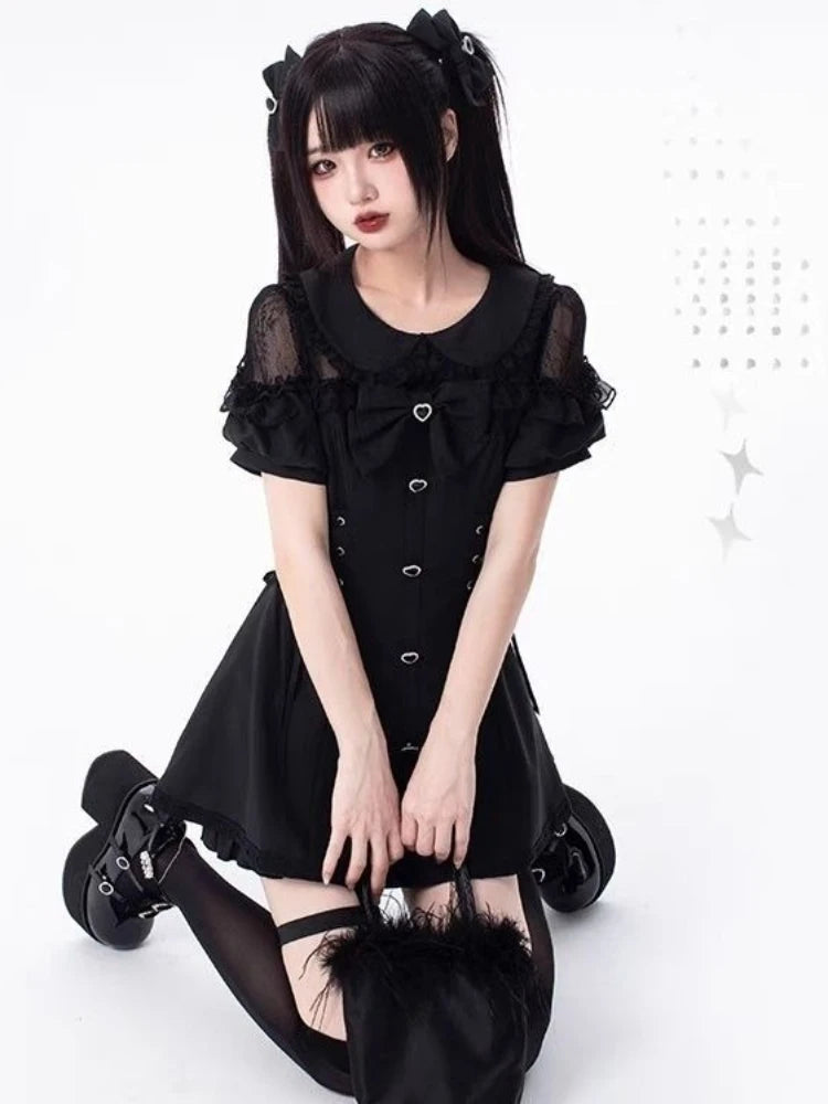 Jirai Kei Sort Flæsekjole med Hjerteknapper