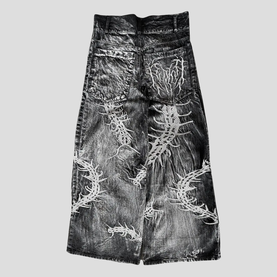 Grå denimnederdel med tornbroderi i metal-stil