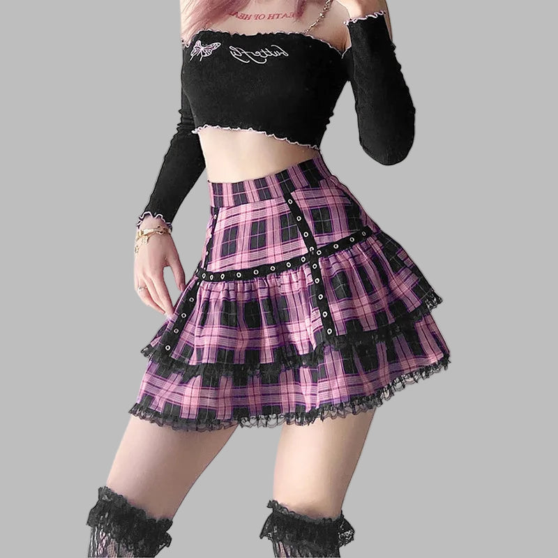 Punk Rock Grunge Nederdel i Ternet Mønster med Blondekant Se muligheder