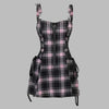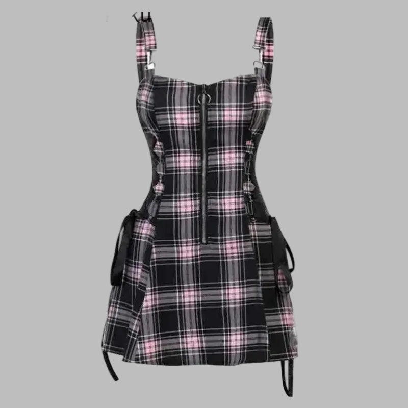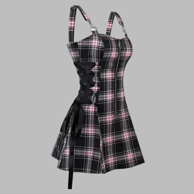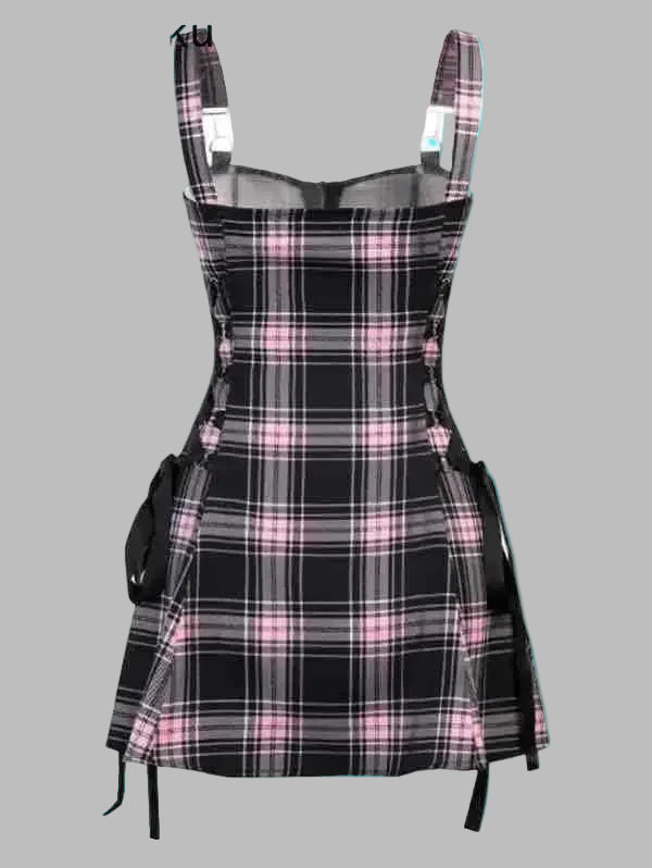 Punkternetkjole i lyserødt tern med seler og bånd
