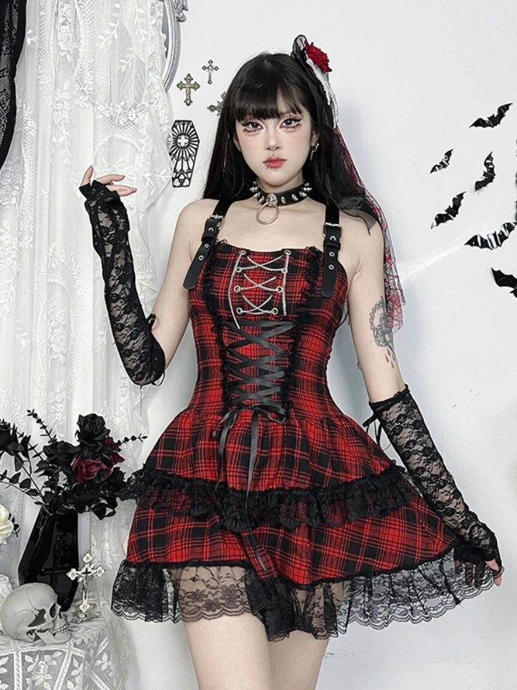 Rød punk rock kjole med kæder og blonde Se muligheder