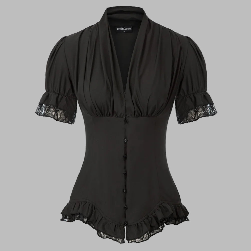 Sort bluse i metalstil med blonde og korte ærmer XXL