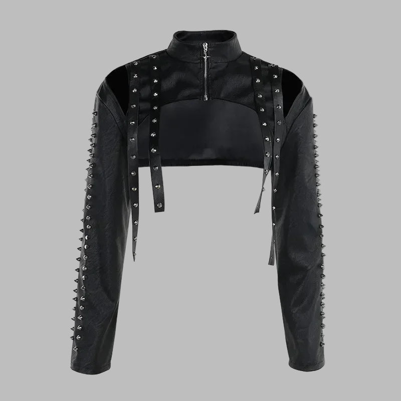 Sort bolero i læder med nitter og pigge i punk goth-stil