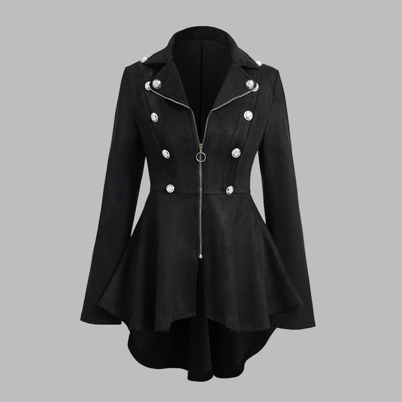 Sort gotisk damefrakke med vidde, knapper og lynlås
