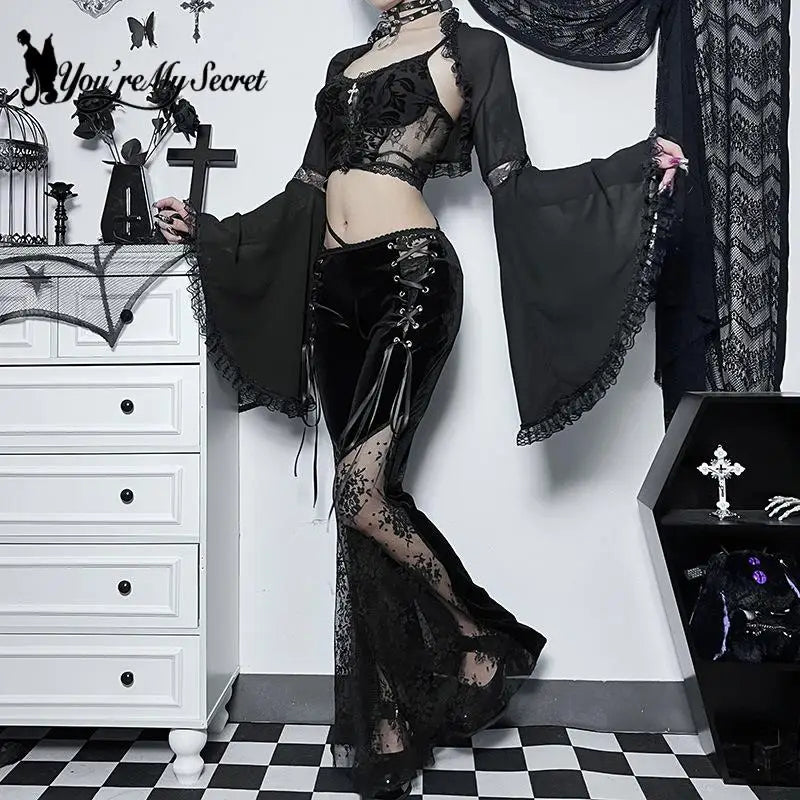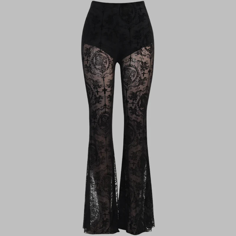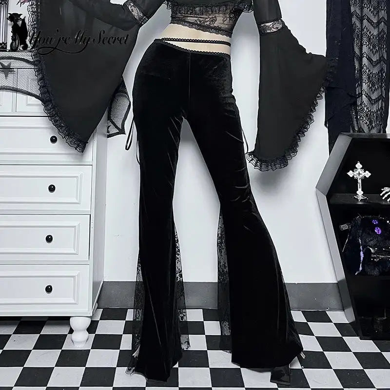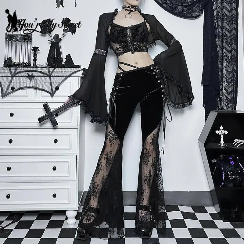 Sort gotiske bukser med slidser og blonde detaljer i sort