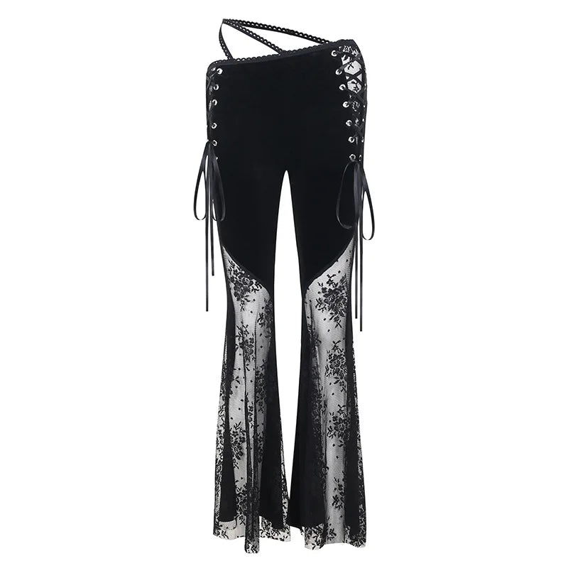 Sort gotiske bukser med snit og blonde detaljer i sort