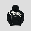 Sort hættetrøje i metalstil med hvidt logo og tekst