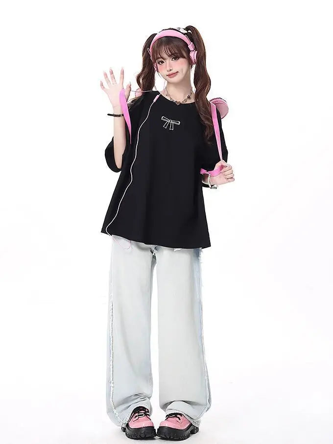Jirai Kei sweatshirt med snøring på ryggen og lyserød sløjfe sort