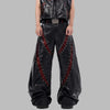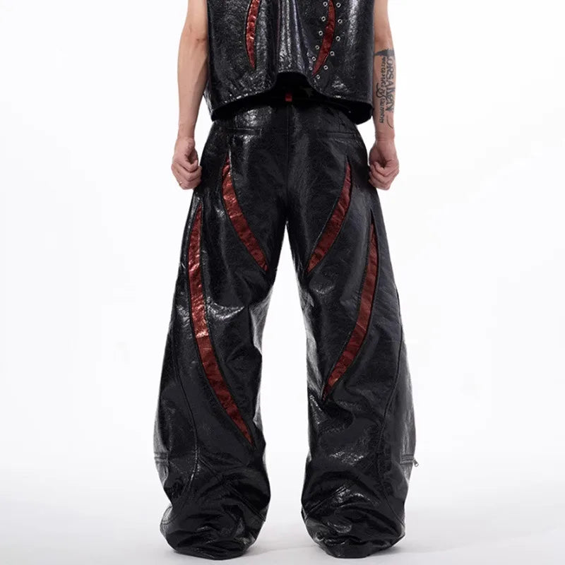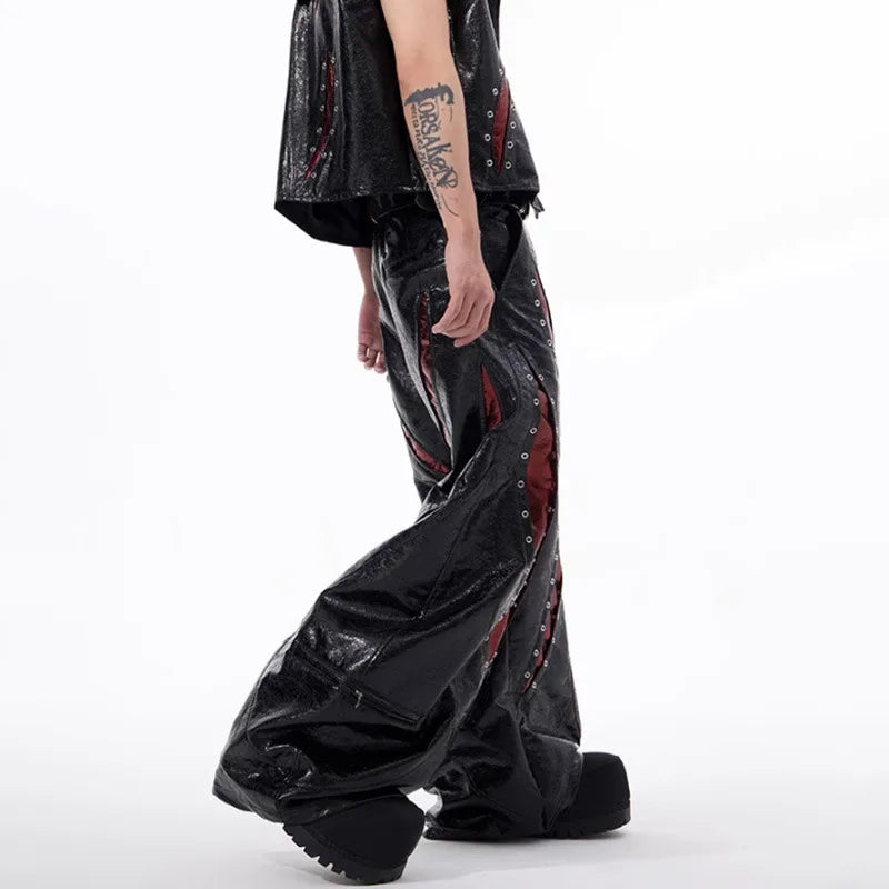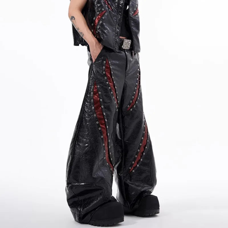 Sort læderbukser i steampunk-stil med bordeaux striber og nitter