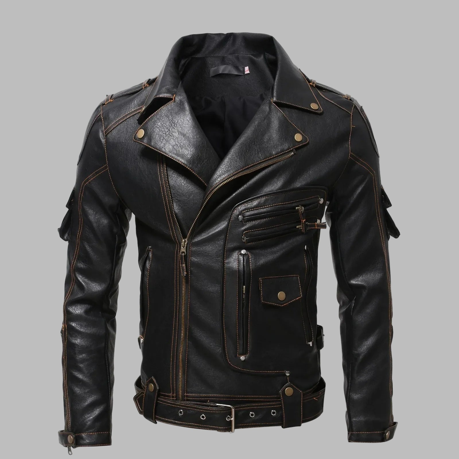 Sort læderjakke med nitter og stropper, goth punk stil, til mænd, motorcykel, sort