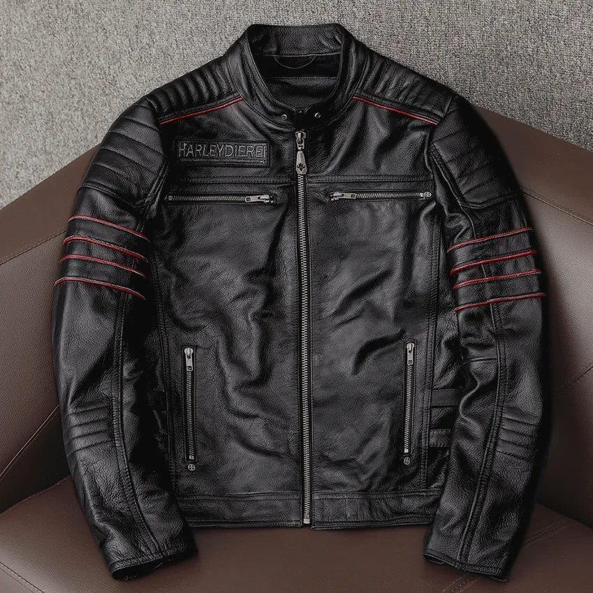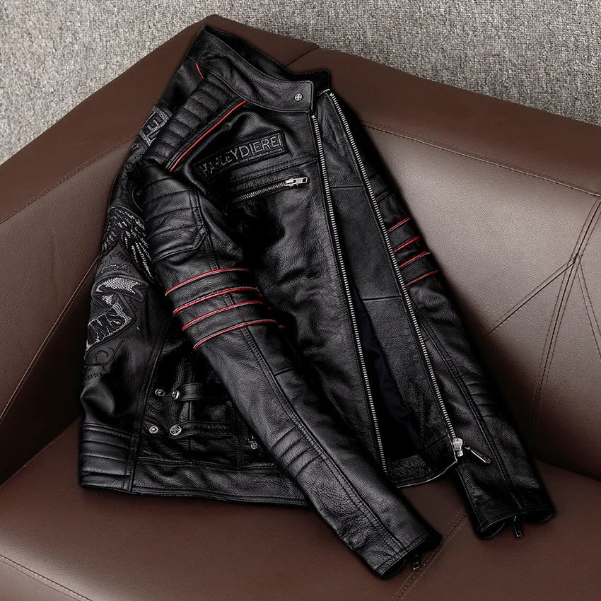 Vælg en dristig stil med denne herrejakke i ægte læder, dekoreret med broderier og et kraniemotiv. Designet med henblik på rejser, byudflugter og motorcykelentusiaster, kombinerer den holdbarhed, komfort og en unik karakter. Perfekt til overgangssæsonen.