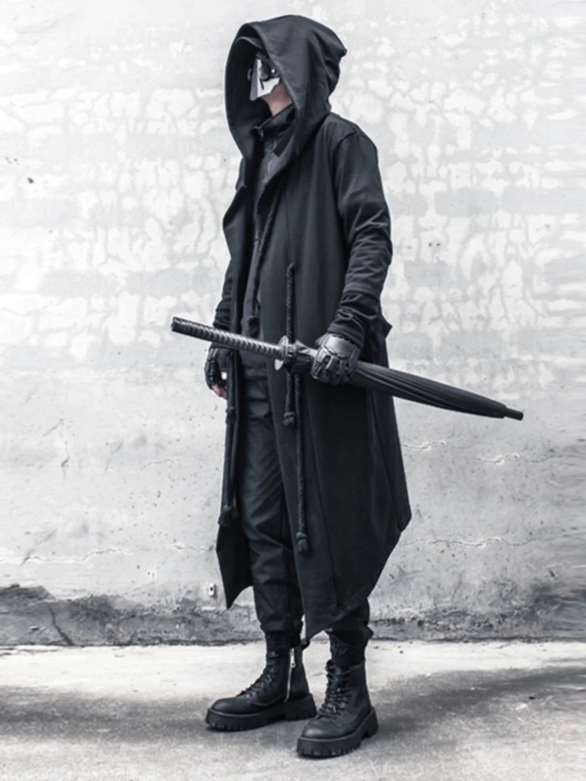 Sort lang herrefrakke med hætte – Techwear stil 6XL