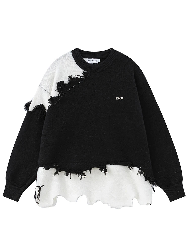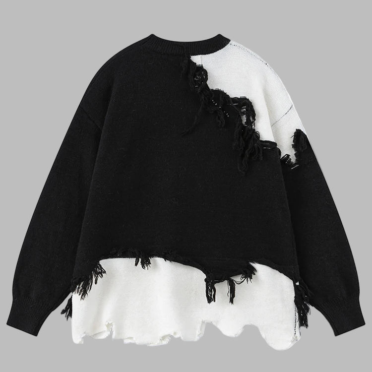 Sort og hvid punk sweater med slid og frynser Se muligheder