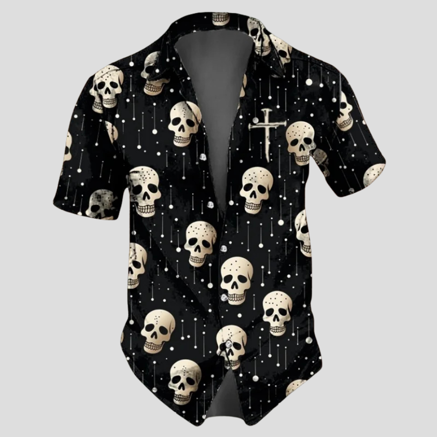 Sort Punk Skjorte med Kranier og Kors Kort Ærme