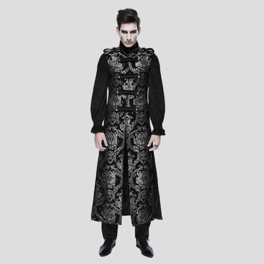 Sort steampunk goth frakke med brokademønster og stropper