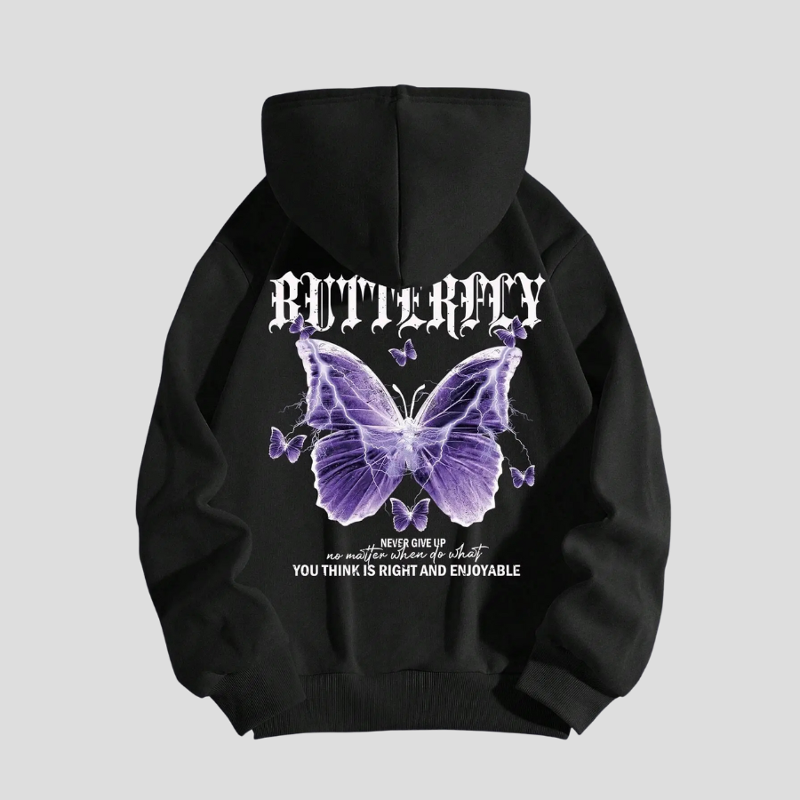 Sort sweatshirt med lilla sommerfugle og tekst i punk-stil