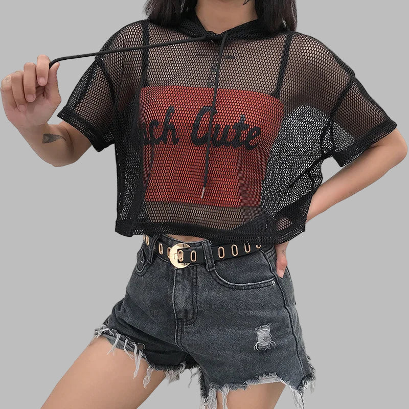 Sort T-shirt med net og hætte i punk-stil Se muligheder