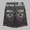 Sort denimshorts i metalstil med kors og sværd grunge