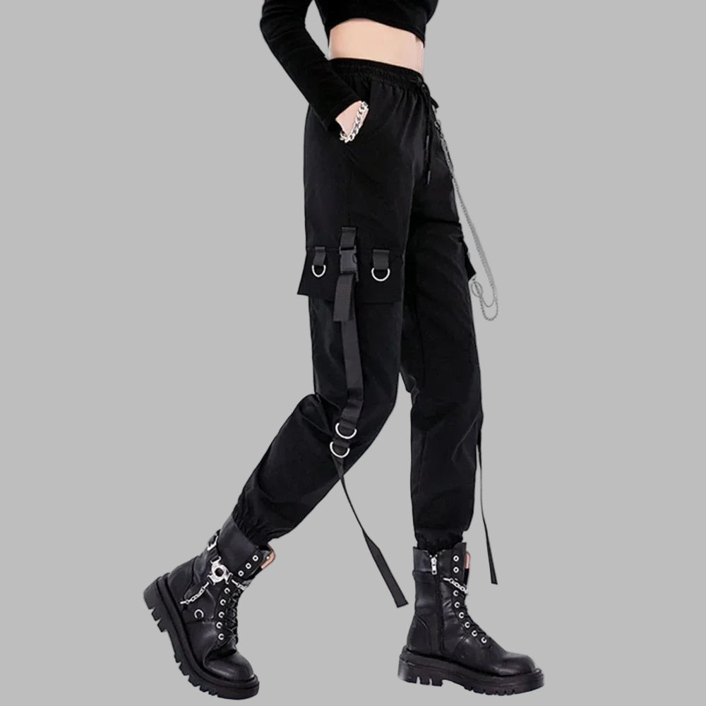 Sort bukser i punkstil med metalringe og taktiske stropper