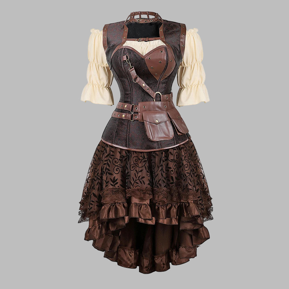 Steampunk Kjole Korset med Stropper og Tasker Brun