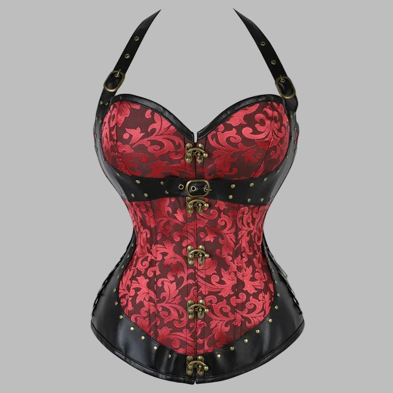 Steampunk korset i rød brokade med sorte læderelementer og spænder
