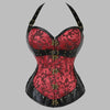 Steampunk Korset Rød Brokade med Sorte Læderdetaljer og Spænder