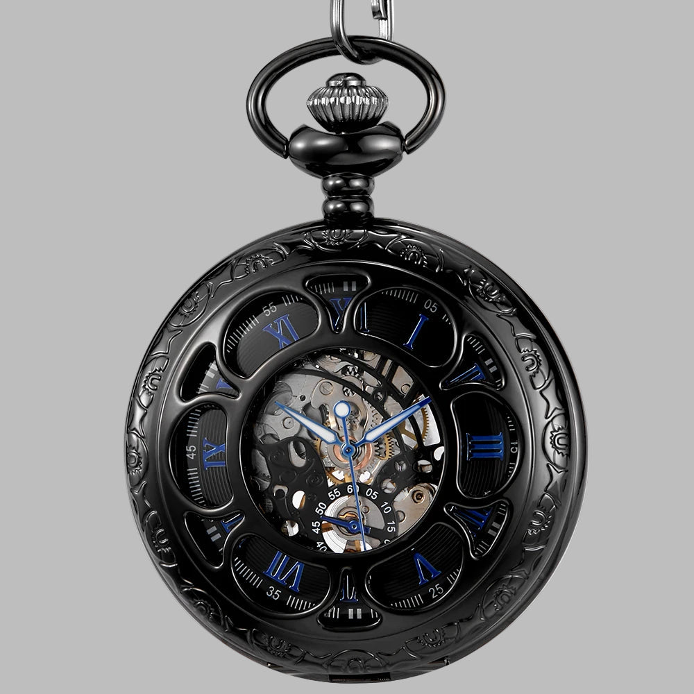 Steampunk Sort Mekanisk Lommeur med Blå Accenter